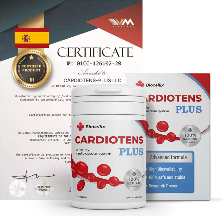 - Hasta la fecha, solo hay un remedio en España que hace bien esta tarea. Se llama Cardiotens Plus. Este fármaco fue creado en 2021 por el Instituto Vascular y Cardíaco. El remedio contiene aproximadamente 40 componentes activos: extractos de plantas útiles para los vasos sanguíneos, vitaminas, micro y macroelementos.